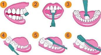 3. 圆弧刷牙法:将牙刷放在牙齿上,以圆弧形移动牙刷,刷到每个牙齿的表面。
